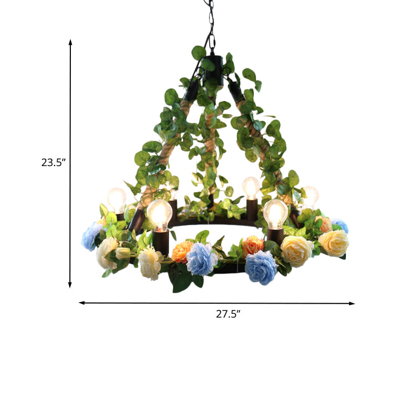 Aldhanab – Kronleuchterlampe aus Metall mit 6 Lichtern, freiliegende Glühbirne, Loft-Stil, schwarze Pendelleuchte aus Metall mit Ring und künstlicher Blütenblatt-Deko