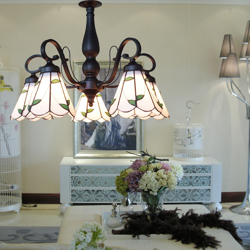 Rustic Cone Pendant Light With Gooseneck Rhombus/Leaf Pattern - 5 Lights Stained Glass Chandelier