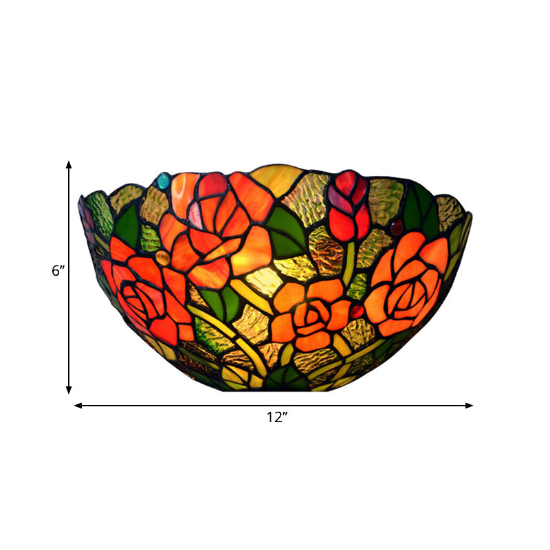 Diese viktorianische Wandleuchte aus Metall und Glas hat eine gelbe Oberfläche und einen schalenförmigen Lampenschirm aus geschliffenem Glas mit Rosenmuster. Sie ist 25 bis 35 cm breit, 15 cm hoch und 30 cm breit. Der Glasschirm ist im Lieferumfang enthalten. Die Wandleuchte verwendet eine LED-, Glüh- oder Leuchtstofflampe mit einer Spannung von 110–120 Volt und verfügt über eine direkt verdrahtete Stromquelle.
