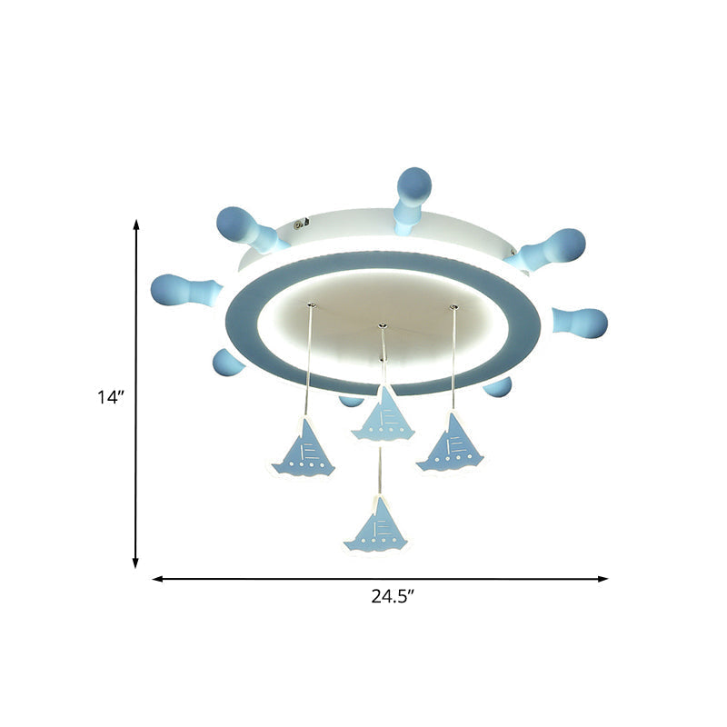 Marine Steering Wheel Flush Light: Kids Room Ceiling Mount Fixture With Sailing Boat Design - Sky