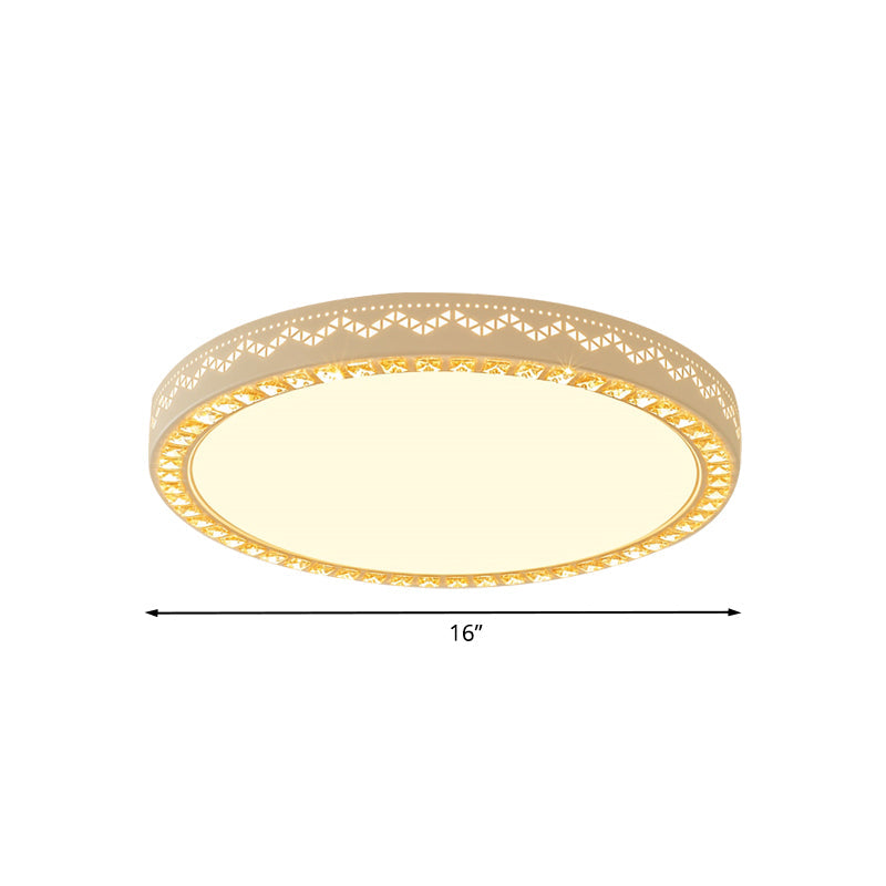 Metal Flat Drum Flush Led Mount Lamp Fixture In White With Crystal Accent