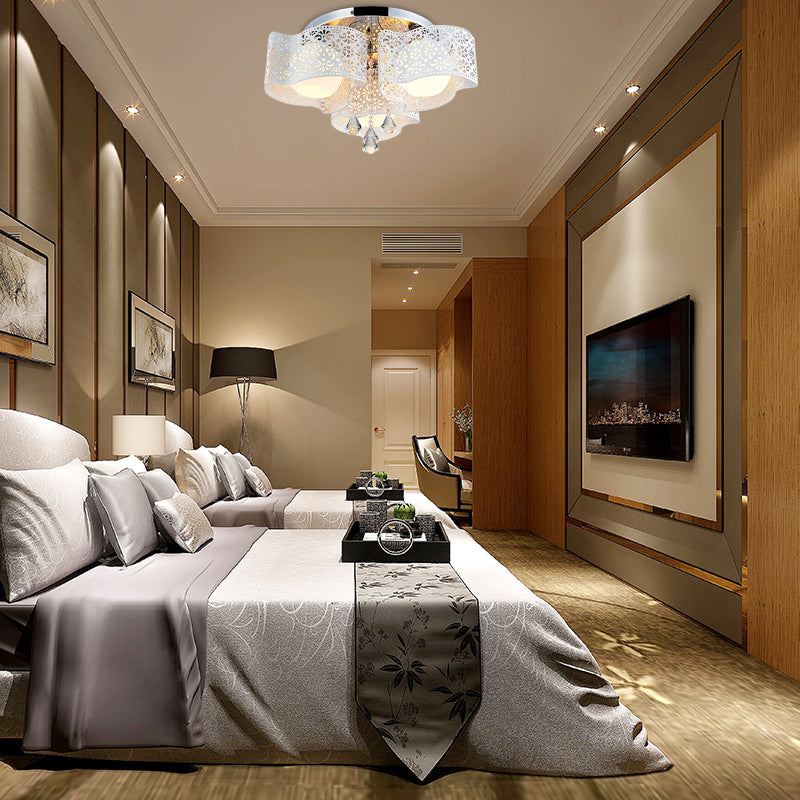 Modernistische Kristall-Deckenlampe mit geätztem Blumendesign, 3/5 Lichter, Opalglas-Kugelschirm (Rosa/Weiß)