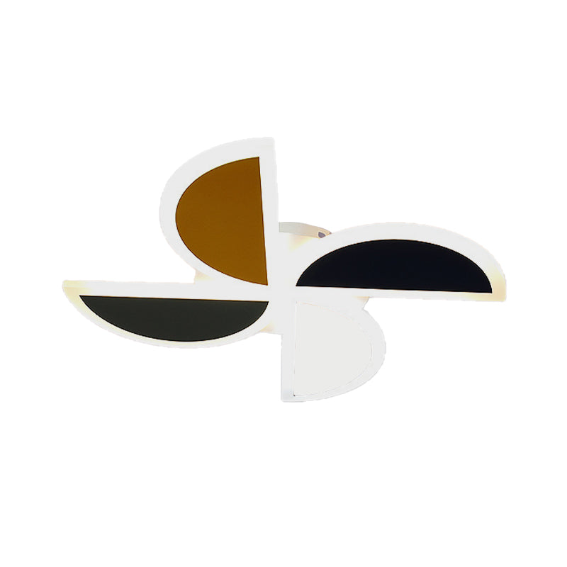 Diese Deckenleuchte heißt „Nordic Windmill Acrylic Ceiling Lamp“. Es handelt sich um eine flächenbündige LED-Leuchte in grün-gelb-pinkem Design. Insgesamt gibt es vier Leuchten, die maximale Wattzahl beträgt 39 Watt. Die Produktabmessungen betragen 49,5 cm B x 59,5 cm L x 40,6 cm H. Die Lichtfarbe lässt sich mit der mitgelieferten Fernbedienung ändern.