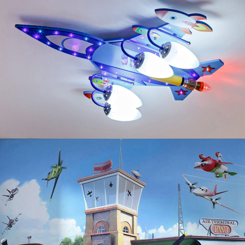 Blaue Flugzeug-Deckenleuchte für Kinderzimmer – Moderne Deckenbeleuchtung aus Holz und Glas