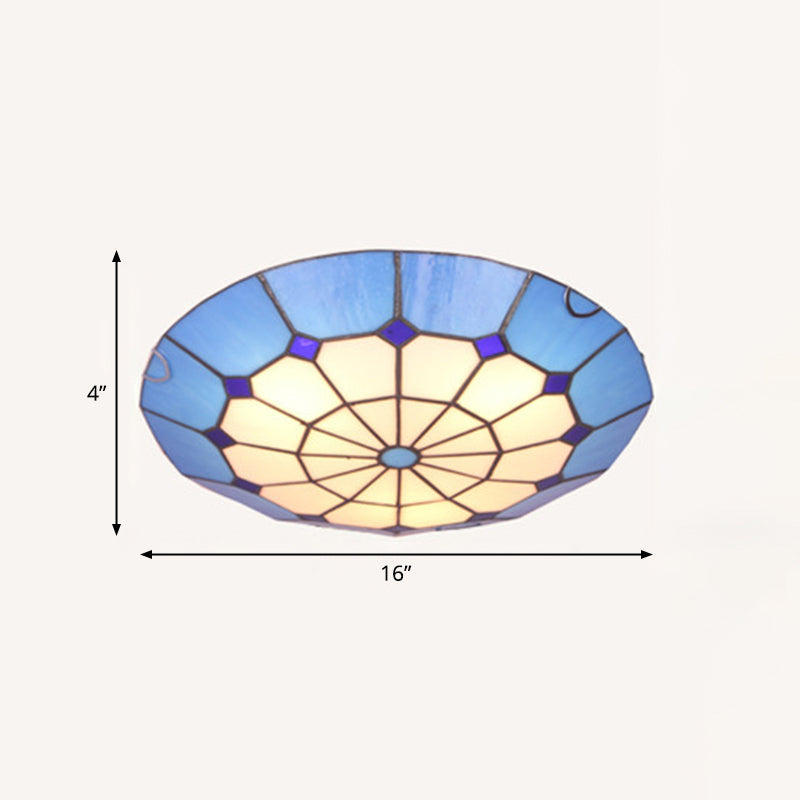 Tiffany Dome Shade Led Flush Mount Lighting For Bedroom - Gridded Glass Fixture Blue / 16