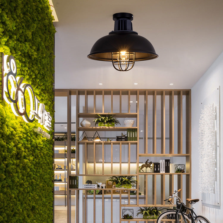 Vintage Wire Cage Ceiling Light With Semi-Flush Mount & Bowl Shade In Black