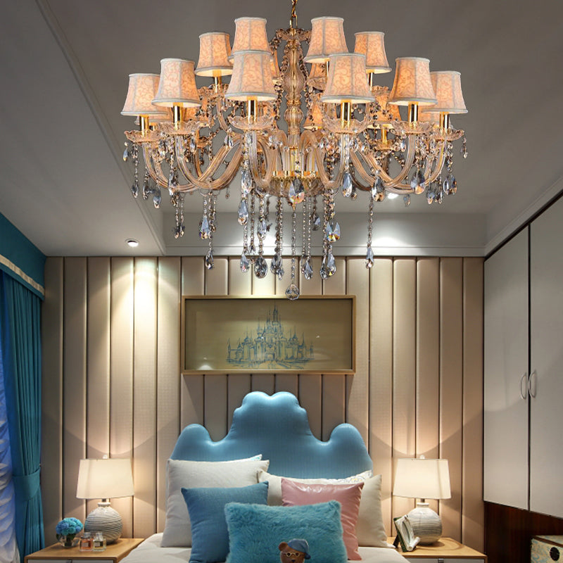 Rustikaler Kronleuchter aus klarem Kristall: 6/8/10 Köpfe, beigefarbene Hängeleuchte mit Stoffschirm