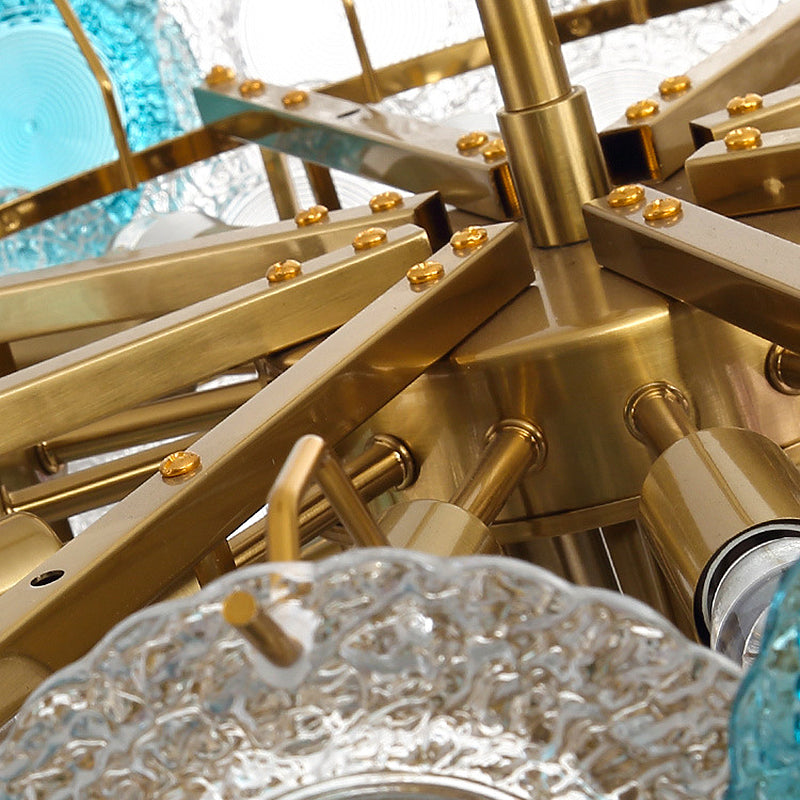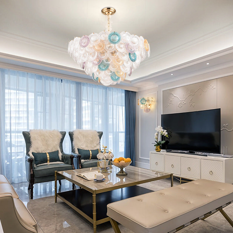 Dieser wunderschöne und moderne Kronleuchter passt perfekt in jedes Zuhause. Er hat eine konische Form mit 12 Glühbirnen, klaren Kristallschirmen und einer Messingoberfläche. Der Kronleuchter ist 52 cm/64 cm breit und 38 cm/35 cm hoch und hat einen runden Baldachin. Er verwendet E12/E14-Glühbirnen (nicht im Lieferumfang enthalten) und ist für 220–240 V oder 110–120 V ausgelegt.