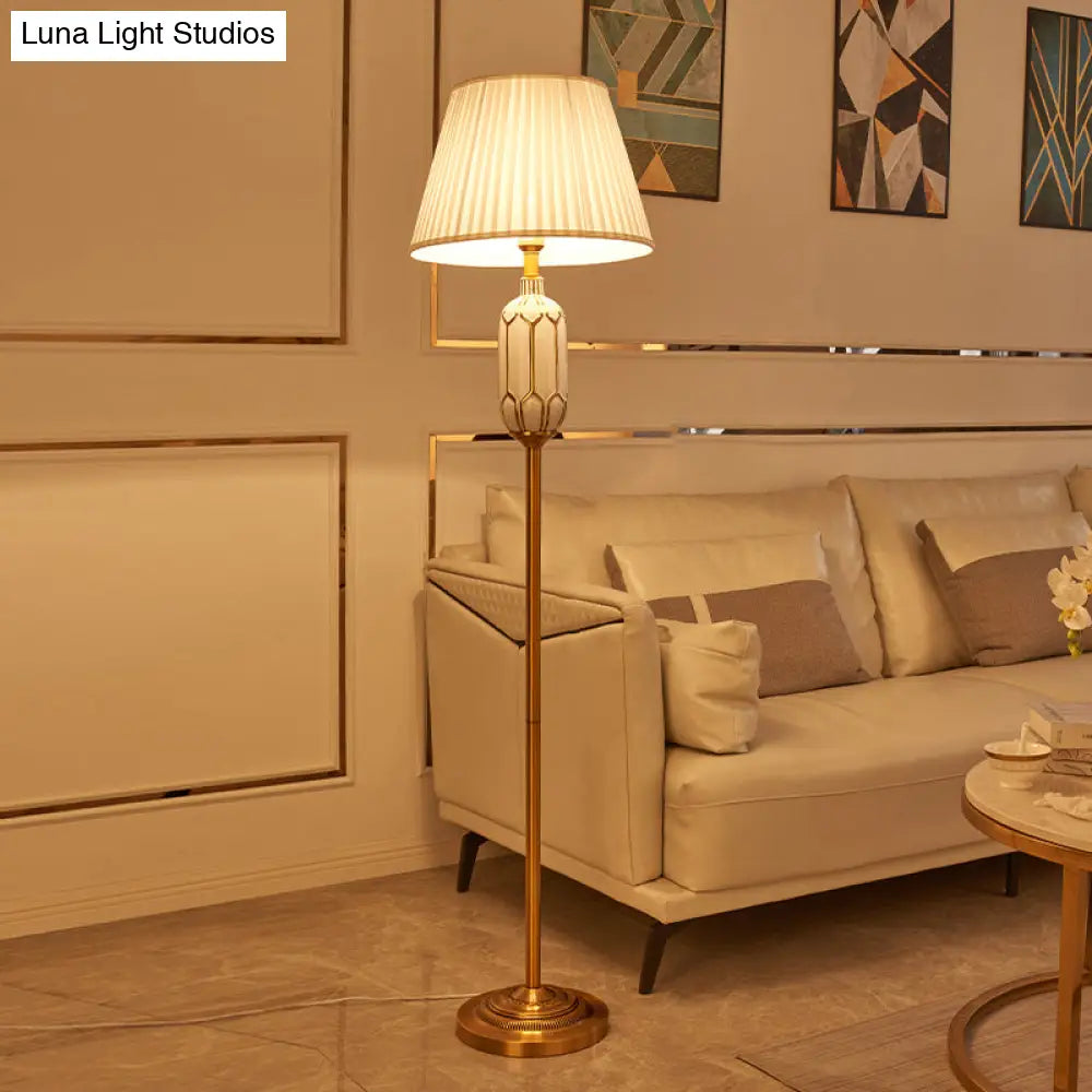 Moderne Einzel-Stehlampe mit Empire-Schirm und plissiertem Stoff – perfekt für das Wohnzimmer