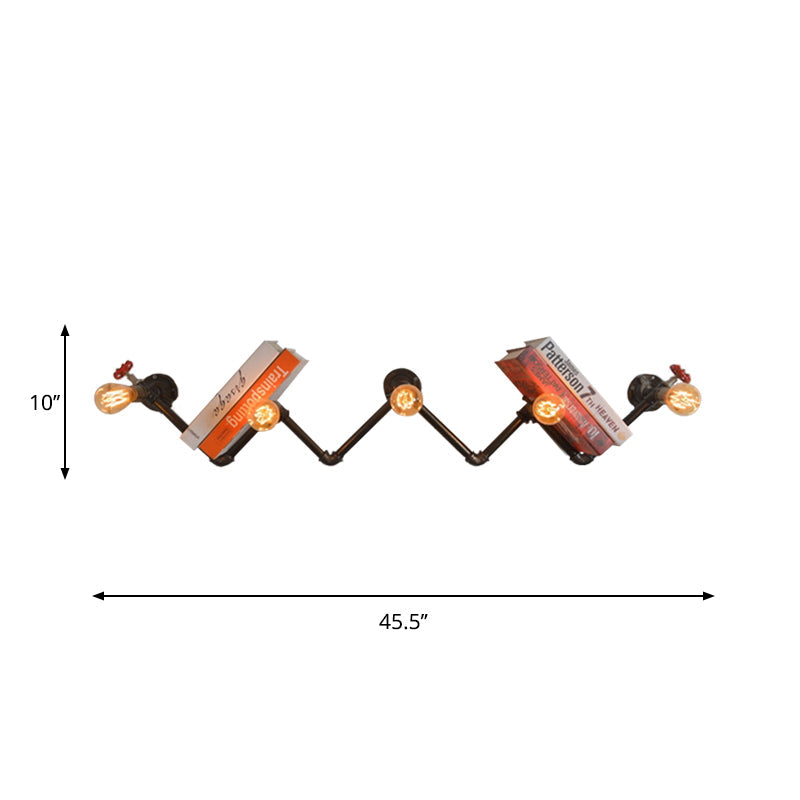 Wandleuchte im Industriestil mit 5 offenen Glühbirnen und Bücherregal-Design aus schwarzem Metall
