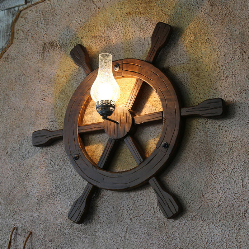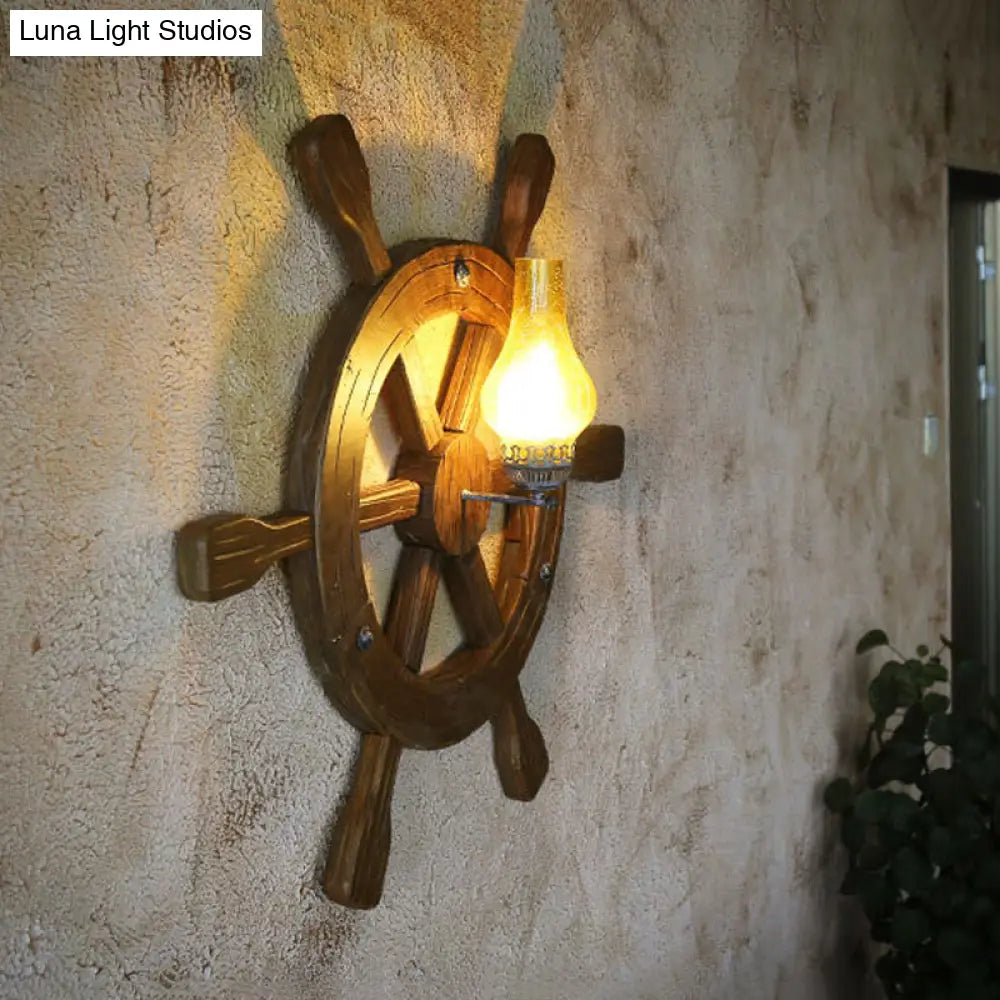 Schwarze Retro-Wandleuchte aus bernsteinfarbenem Crackle-Glas mit Holzruder-Deko
