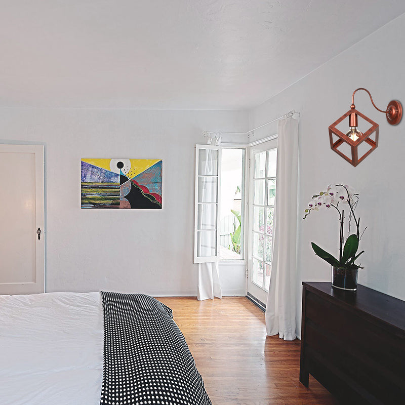 Vintage Metal Wall Sconce With Gooseneck Arm & Black/Rust Finish - Cube Cage Bedroom Lighting