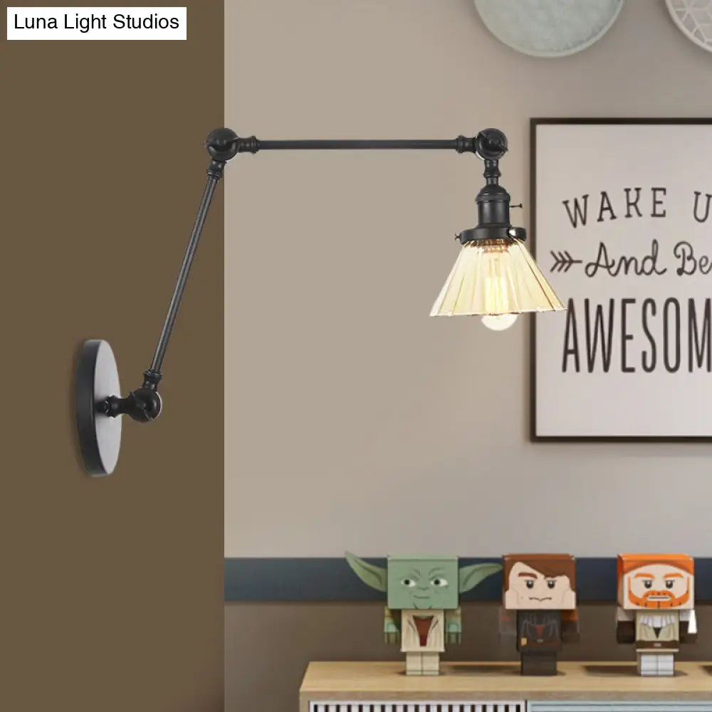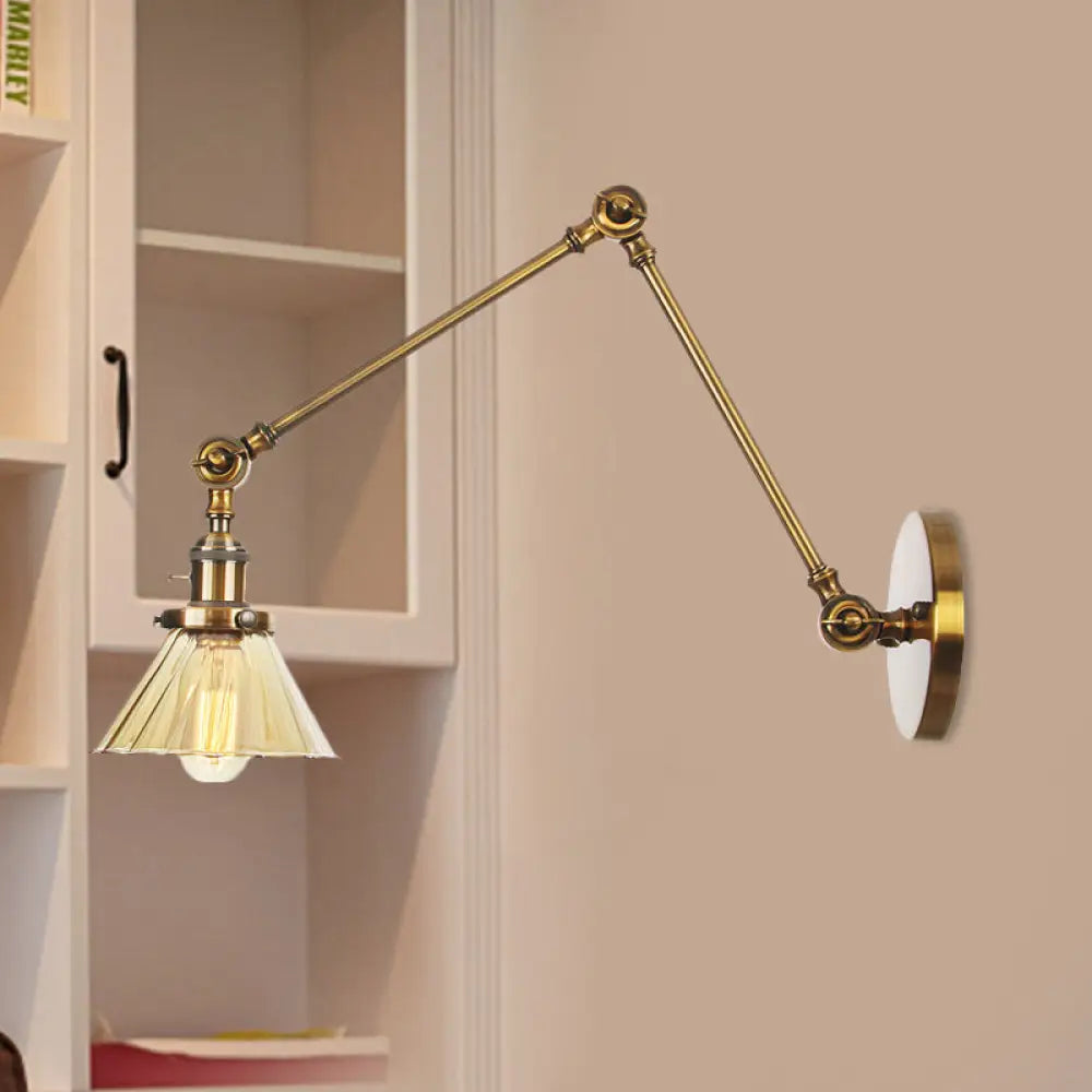 Industrielle kegelförmige Wandleuchte mit klarem/bernsteinfarbenem Glas und Arm – Schwarz/Bronze/Messing (8"+8"/8"+8"+8")