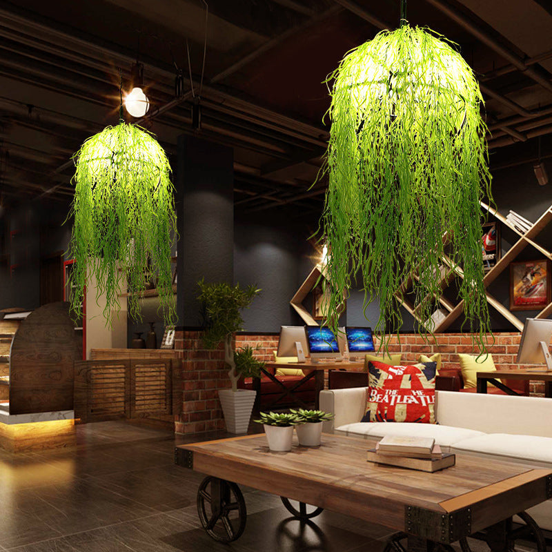 Industrial Green Metal Chandelier With Bell Cage Design And Wicker Ornament 18’/21.5’ Wide -