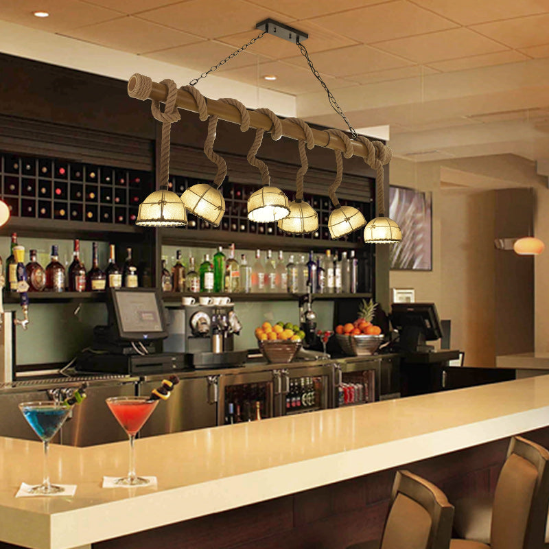 Bauernhaus-Pendelleuchte mit Holzschalenschirm und 6 Stoffinselleuchten für Restaurants