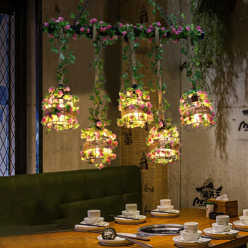 Industrielle 5-flammige Insel-Käfigleuchte aus schwarzem Metall für Restaurants und Pflanzen