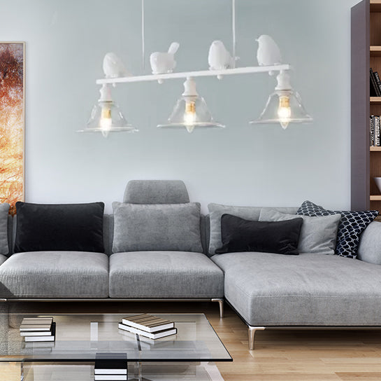 Rustikale Inselleuchte mit Vogelkegel-Schirm – 3 klare Glasleuchten in Weiß für den Balkon
