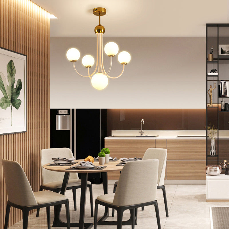 Dieser atemberaubende kugelförmige Deckenleuchter aus weißem Glas ist eine zeitgenössische und moderne Interpretation moderner Beleuchtung. Dieser zeitgenössische Kronleuchter hat ein einzigartiges Design, das jedem Raum eine Vintage-Eleganz verleiht. Der Schirm aus weißem Milchglas verleiht der breiten Struktur dieses Kronleuchters eine weiche Note. Er ist je nach gewünschter Helligkeit mit fünf oder sieben Lichtern erhältlich. Die Höhe dieses Kronleuchters beträgt 74 cm und die Breite 59 cm.
