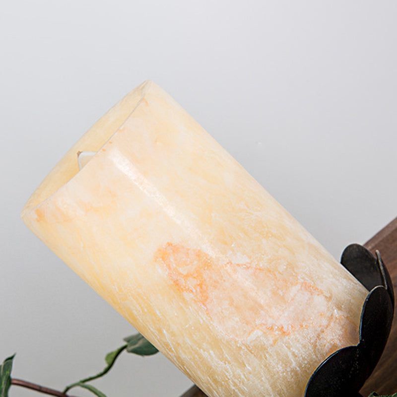 Linearer Insel-Kronleuchter aus Holz im Landhausstil mit 4 braunen Köpfen und zylindrischem Schirm