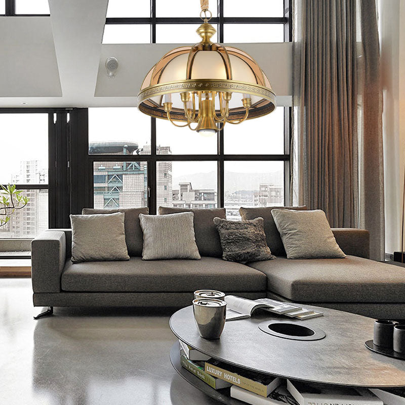 Dieser wunderschöne, schalenförmige Kronleuchter ist perfekt für jede Küche. Er besteht aus Messing mit einem Schirm aus Milchglas. Der Kronleuchter ist 41,9 cm breit und 52,1 cm breit. Er verfügt über 7 Glühbirnen, die ein warmes, einladendes Licht abgeben.