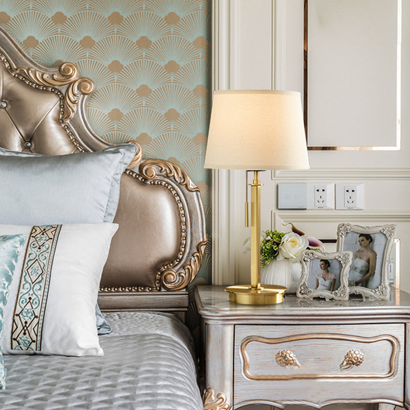 Modernistische weiße Tischlampe mit Zugkette – Fassförmiger Stoffschirm, 1-flammiges Nachttischlicht
