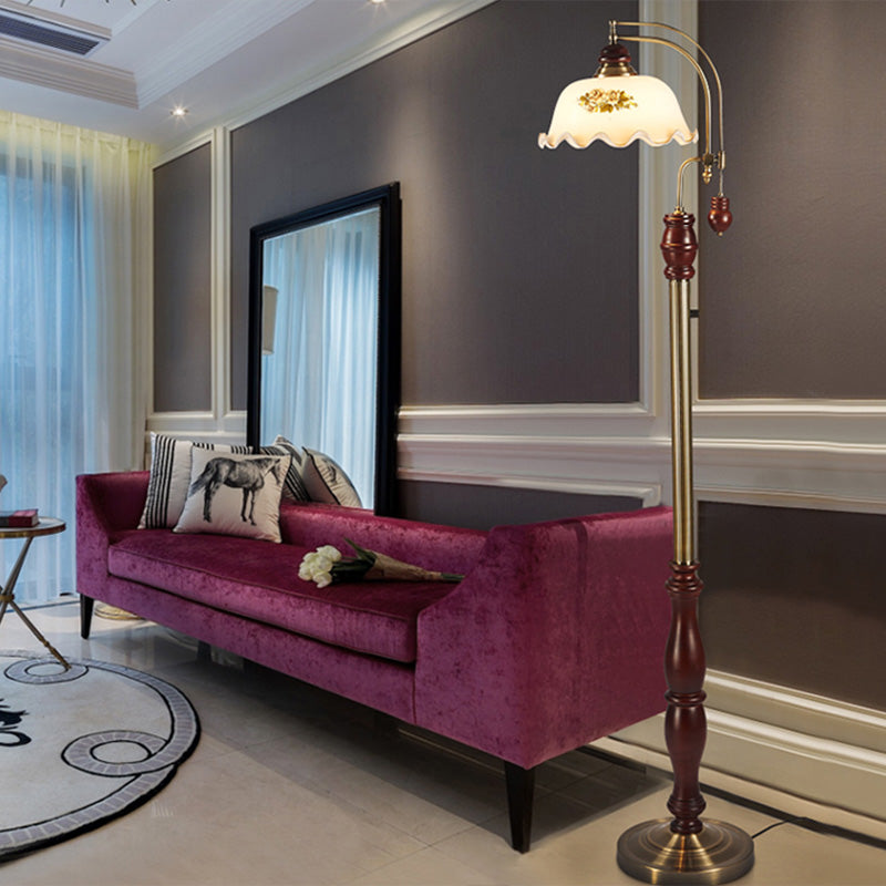 Stehlampe im traditionellen Stil mit cremefarbenem Glasschirm und Blumenmuster und Holzsockel in Braun