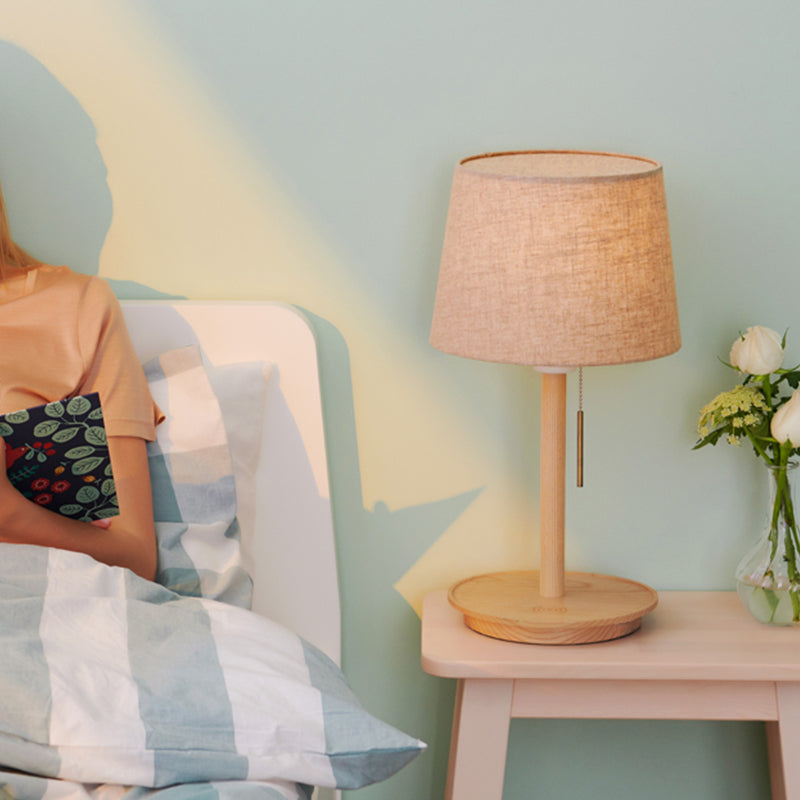 Moderne Nachttischlampe aus Flachsstoff mit ausgestelltem Schirm und Zugkette