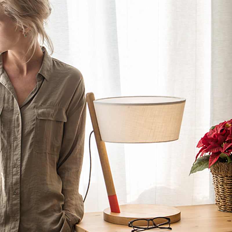 Japanische Schreibtischlampe mit weißem Schirm, Stoffschirm und kreisförmigem beigem Holzsockel