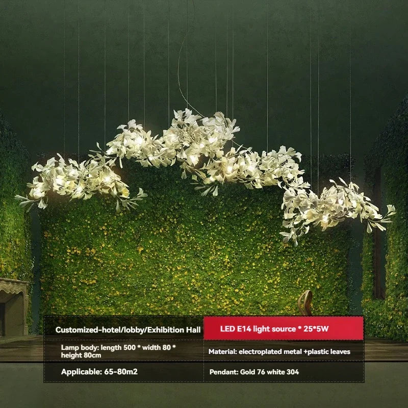 Crafted from premium aluminum with ginkgo branch-inspired detailing, it merges artistry with functionality, making it a true statement light for high-ceiling spaces.