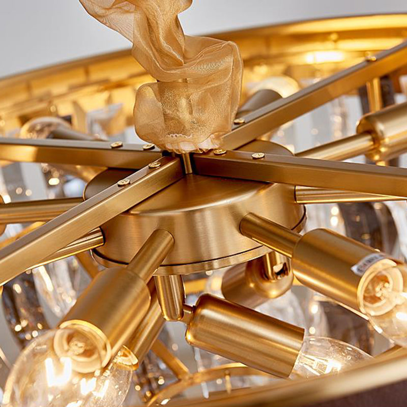 Dies ist ein moderner, kegelförmiger Kristall-Pendelleuchter mit elf Leuchtenköpfen. Der Kronleuchter ist braun, die Hängeleuchte klar. Die Spannung beträgt 110–120 V, 220–240 V. Der Lampensockel ist E12/E14. Die Leuchtmittel sind LED/Glühlampen/Leuchtstofflampen.