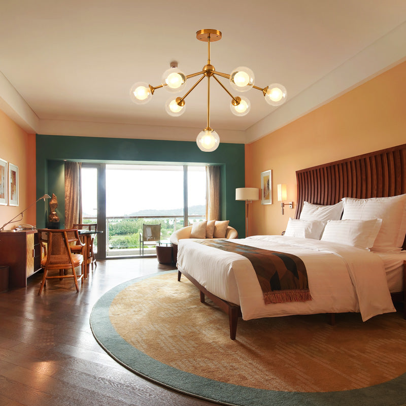 Bei diesem Produkt handelt es sich um einen modernen Kronleuchter im Sputnik-Stil. Es handelt sich um einen Metallkronleuchter mit klaren Glaskugelschirmen. Er verfügt über 4/7/10 Leuchten und ist für die Deckenmontage vorgesehen. Er eignet sich gut für ein Schlafzimmer.