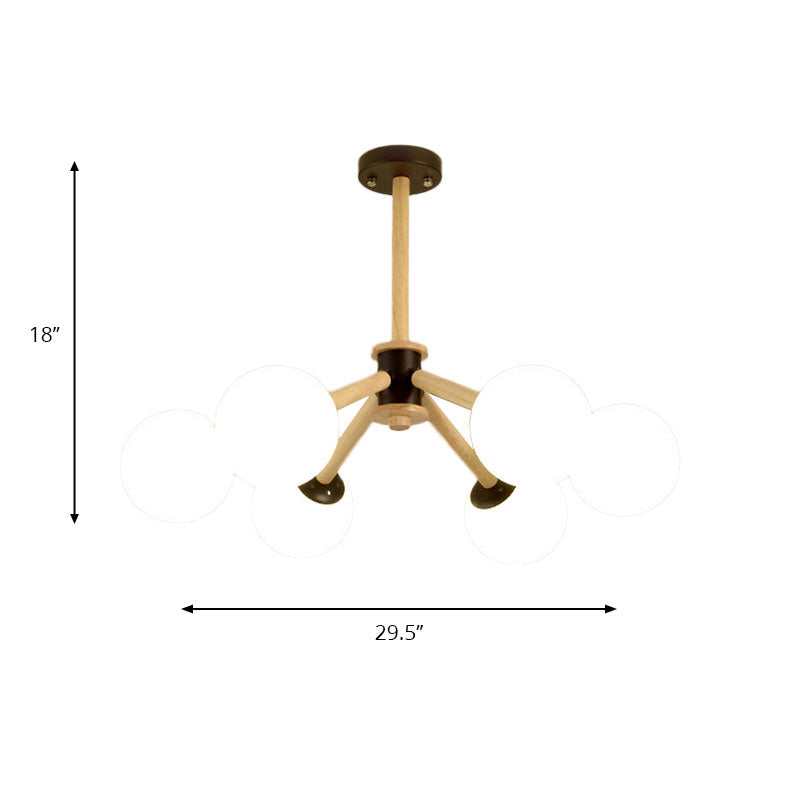 Moderner 6-flammiger Trauben-Kronleuchter mit Holzzweig und weißem Glas