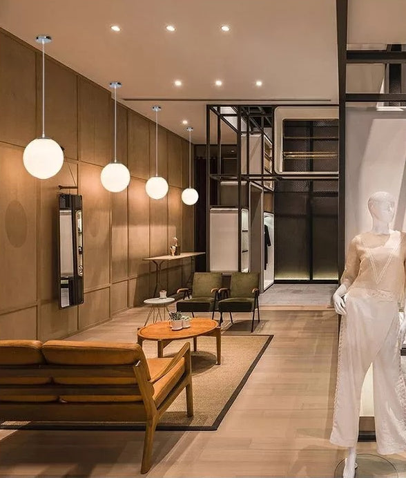 Moderne 1-flammige Pendelleuchte mit Glaskugel für die Decke eines Bekleidungsgeschäfts – schlicht und weiß