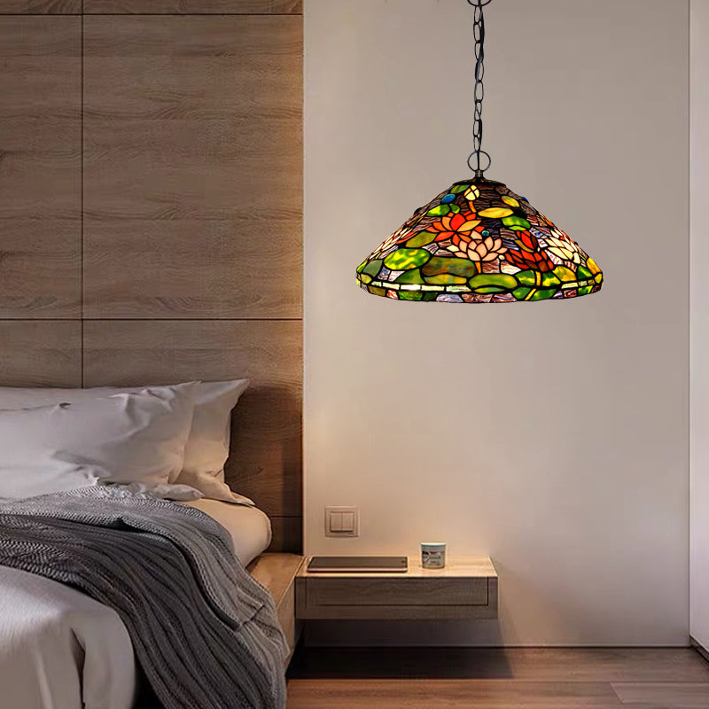 Bei diesem Produkt handelt es sich um eine grüne Buntglas-Pendelleuchte im Tiffany-Stil.
