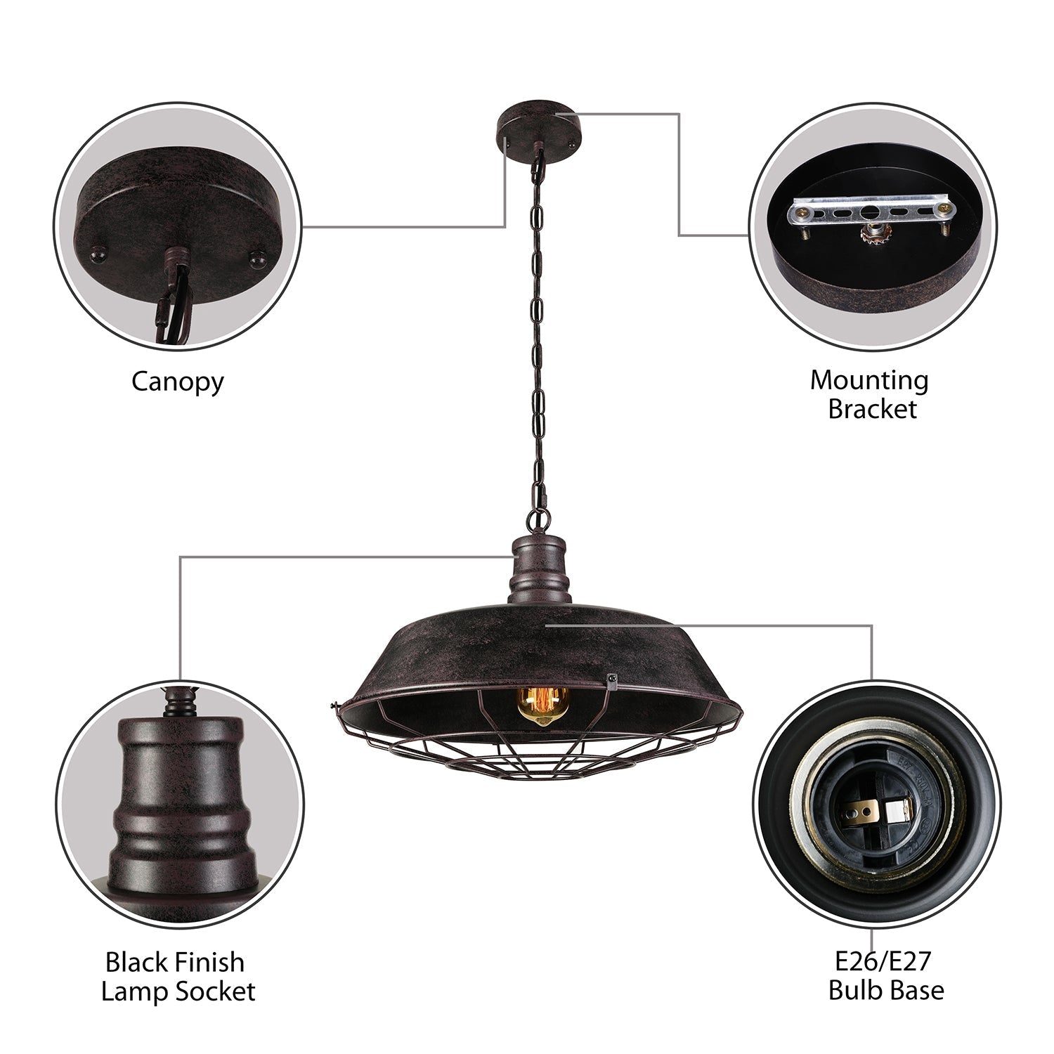 Rustic Wire Frame Hanging Light With Barn Shade - Wrought Iron Ceiling Fixture In Bronze