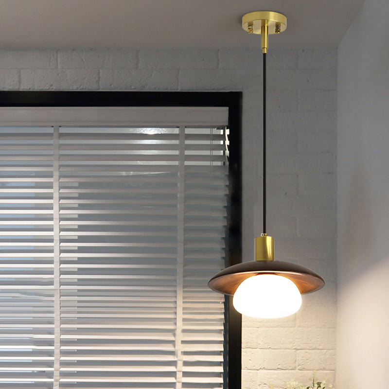 Modern White Glass Ball Suspension Lamp With Brown Wood Saucer Top