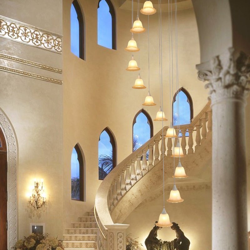 Modern Spiral Design 12-Light White Glass Flower Pendant Ceiling Lamp For Stair Hanging