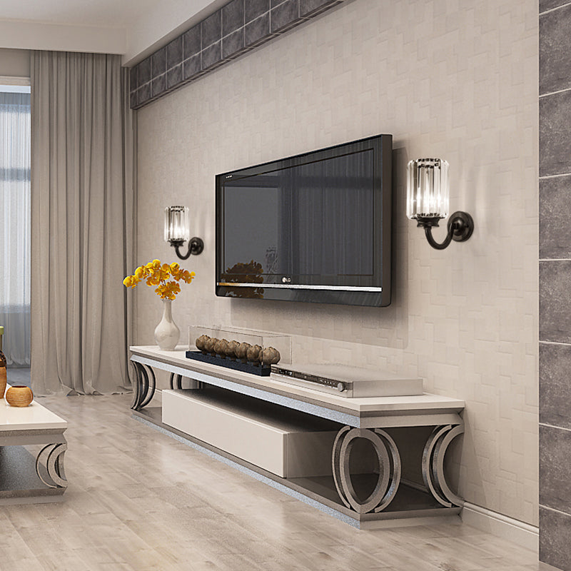 Modern Clear Crystal Drum Wall Lamp With Metal Curved Arm - Black Sconce Light Fixture