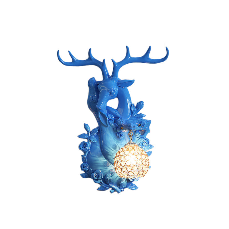 Wandleuchte im Loft-Stil mit klarem Kristallschirm, blau-goldenem Finish und Hirschkopf-Akzent