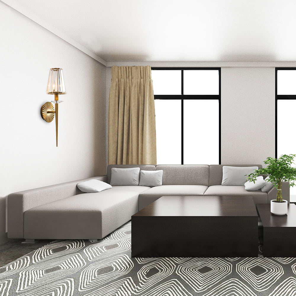 Moderne konische Wandleuchte in Gold mit klarem Kristall und Metall – perfekt für die Wohnzimmerbeleuchtung