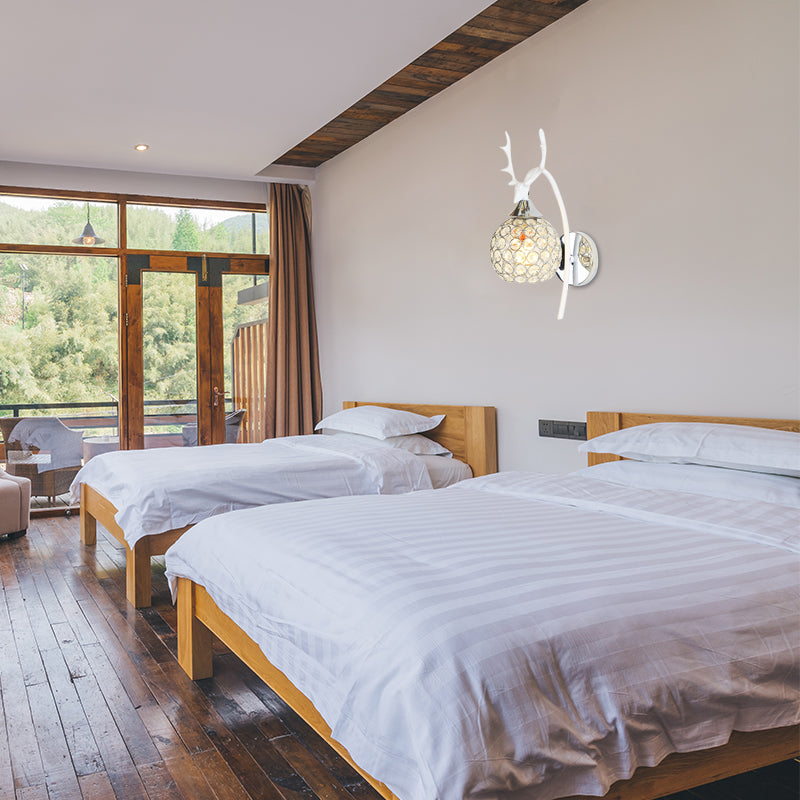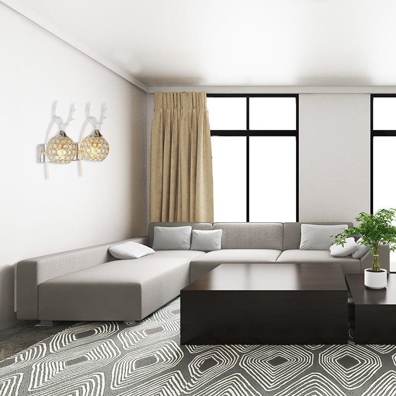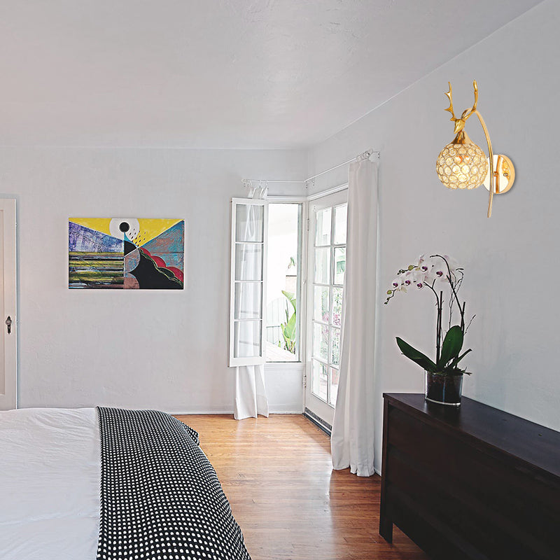 Wandleuchte aus Metall im Lodge-Stil mit Hirschkopf: Wandleuchte mit 1/2 Glühbirnen und Kristall-Kuppelschirm in Chrom/Gold