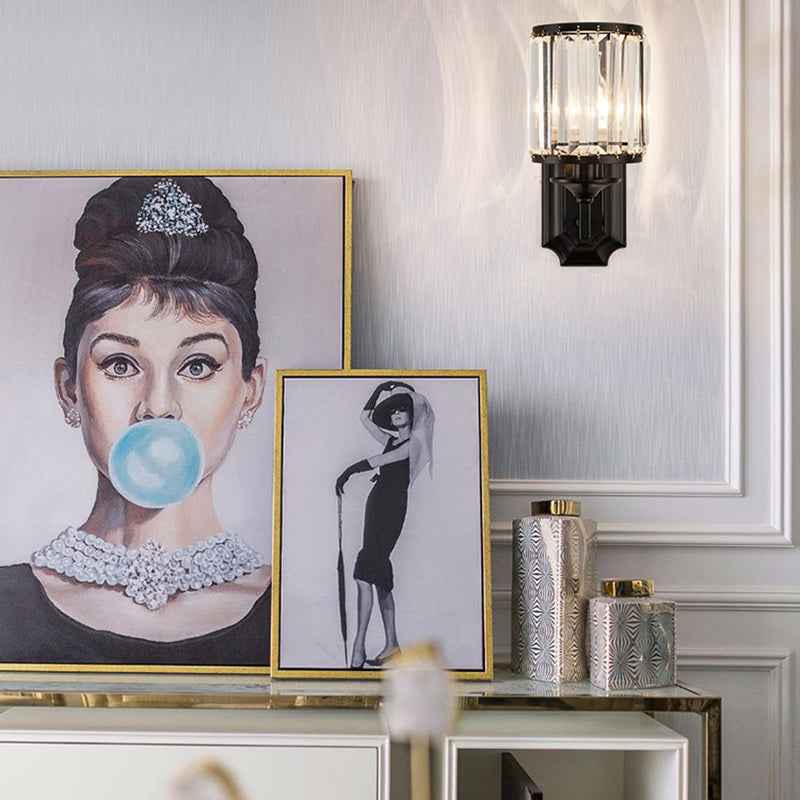 Moderne metallische Zylinder-Wandlampe: 1 Licht-Wandleuchte mit klarem Kristallprisma in Schwarz für den Flur