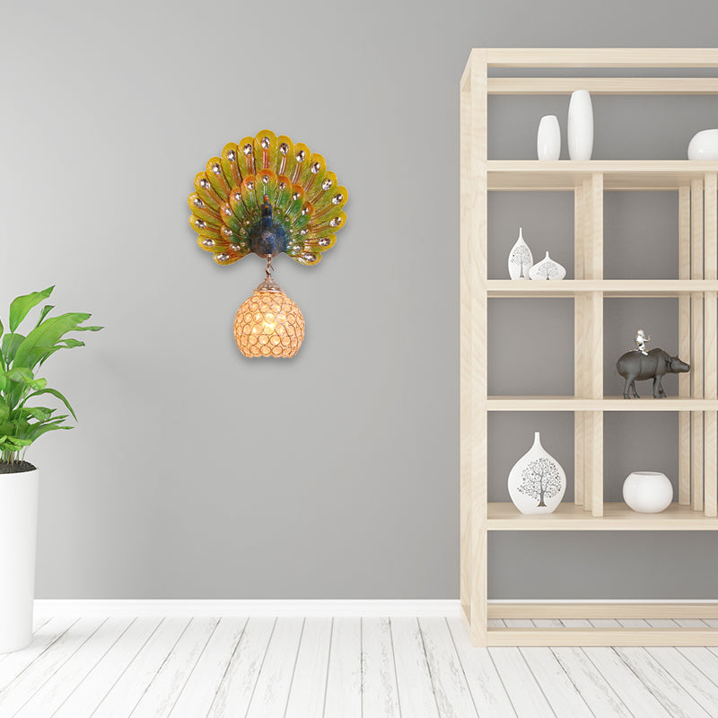 Retro Stylish Wall Sconce With Clear Crystal And Peacock Backplate In Silver/White Silver