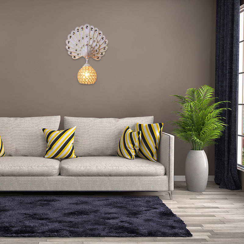Stilvolle Retro-Wandleuchte mit klarem Kristall und Pfauen-Rückplatte in Silber/Weiß