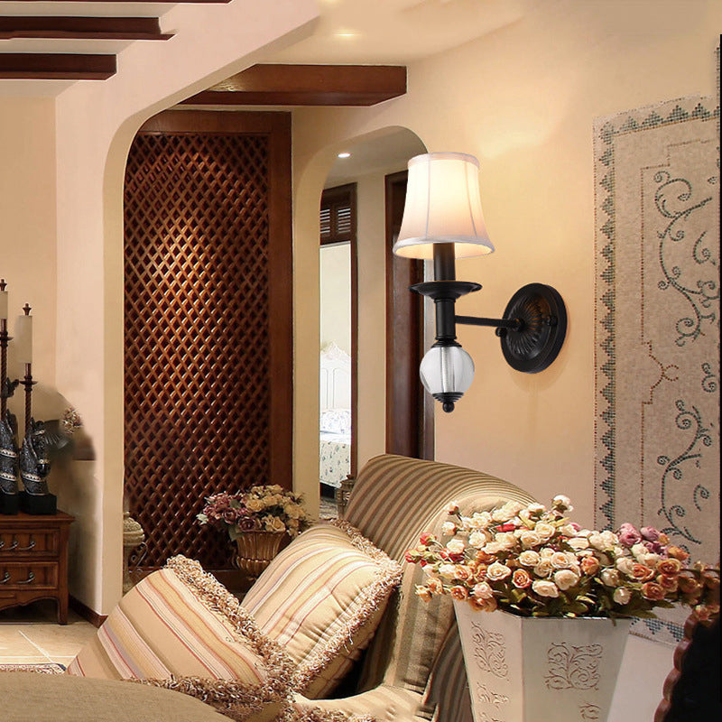 Contemporary White Fabric Bell Wall Sconce: 1 Light Crystal Ball Lamp Black