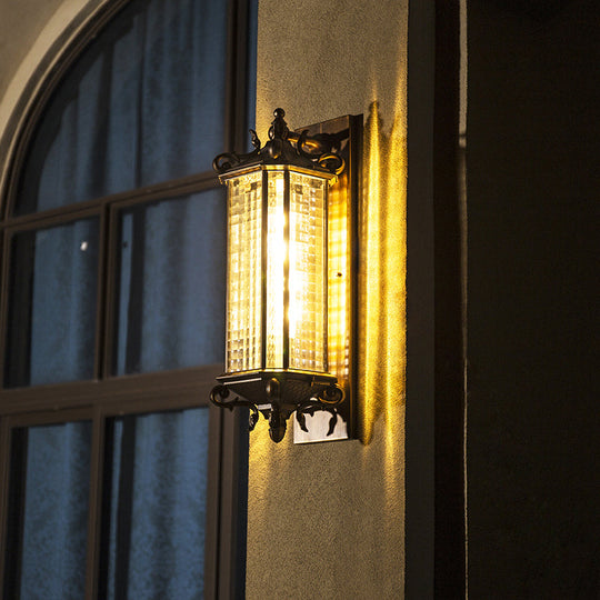 Traditional Bronze Wall Mount Light With Grid Glass And Single Bulb For Courtyard