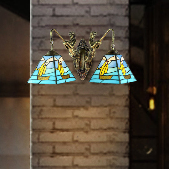 Mediterrane blaue Glas-Segelboot-Wandleuchte – Wandhalterung aus antikem Messing – 2 Köpfe
