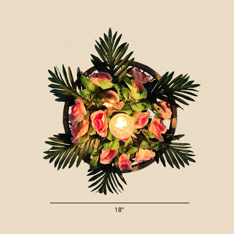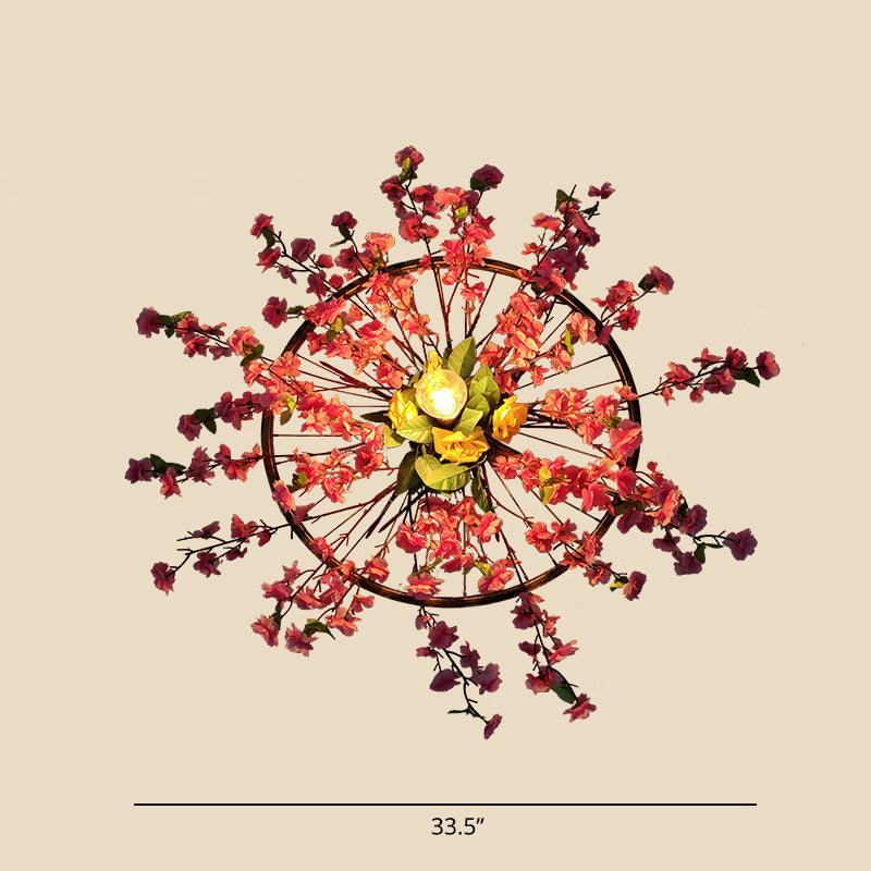Industrial Metal Wall Mounted Lamp With Artificial Plant Décor - Single Wagon Wheel Light Pink