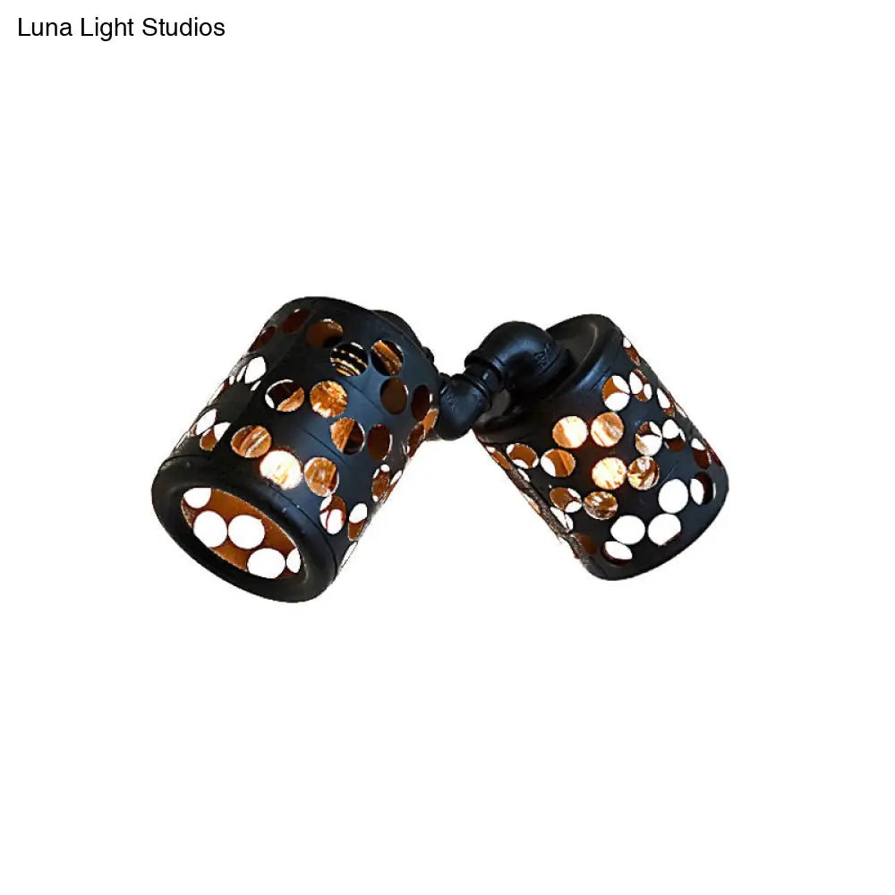Zylindrische Wandleuchte für den Außenbereich – antikes Eisen, 2 Köpfe, schwarzes Finish, mit ausgehöhltem Design