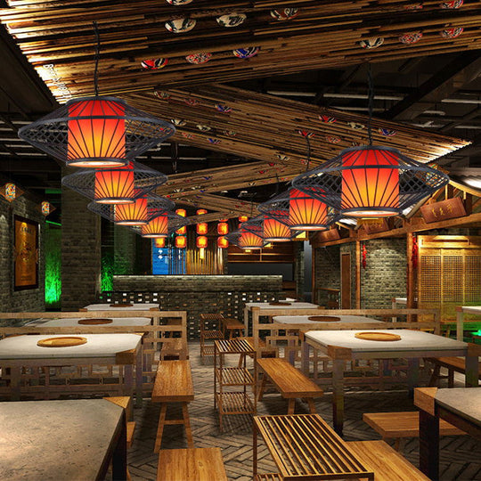 16"/19,5"/23,5" Pendel-Deckenleuchte aus Stoff – rot/gelbes zylindrisches Design mit schwarzem Eisenrahmen